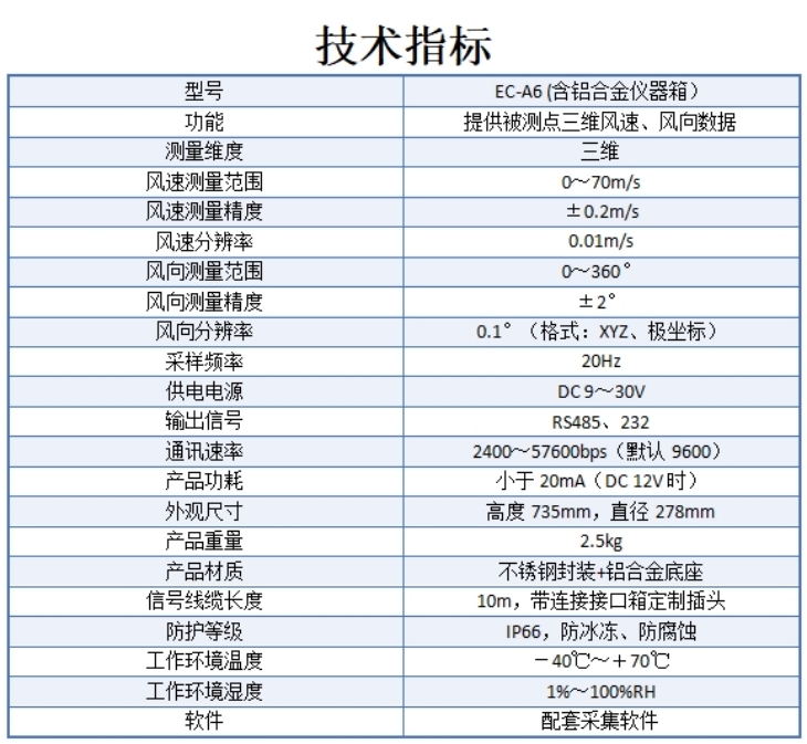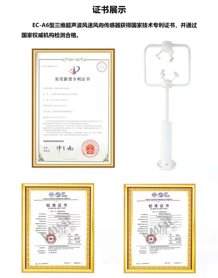 EC-A6型三維超聲波風(fēng)速風(fēng)向傳感器采用先進(jìn)的超聲波測(cè)量技術(shù),獨(dú)特的兩根支撐桿結(jié)構(gòu)設(shè)計(jì),大大減小了風(fēng)阻的影響,提升了測(cè)量的精度。它具有全金屬材質(zhì),沒有任何移動(dòng)部件,堅(jiān)固耐用的特點(diǎn),可以同時(shí)測(cè)量水平和垂直方向的風(fēng)向, X/Y/Z軸風(fēng)速(即U、V、W矢量輸出),聲溫、聲速等參數(shù)。適應(yīng)在各種環(huán)境下,全天候、長(zhǎng)久的正常工作,為各領(lǐng)域的氣象監(jiān)測(cè)提供可靠數(shù)據(jù)。三維超聲波風(fēng)向風(fēng)速傳感器用來測(cè)量近地風(fēng)向、風(fēng)速。廣泛應(yīng)用于城市環(huán)境監(jiān)測(cè)、風(fēng)力發(fā)電、氣象監(jiān)測(cè)、橋梁隧道、航海船舶、航空機(jī)場(chǎng)等領(lǐng)域。