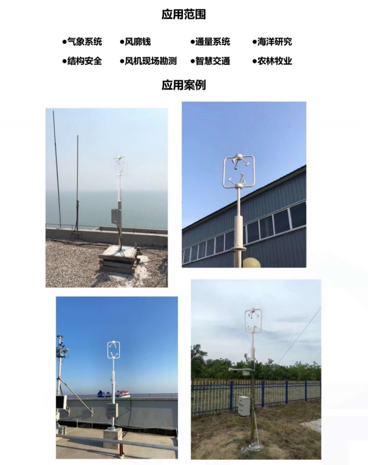三維超聲波風(fēng)速風(fēng)向傳感器具有結(jié)構(gòu)緊湊,沒有任何移動(dòng)部件,堅(jiān)固 耐用的特點(diǎn)。能夠測(cè)量水平和垂直方向的風(fēng)向, X/Y/Z軸風(fēng)速(即U、V、 W矢量輸出)。可以適應(yīng)在各種環(huán)境下,全天候、長(zhǎng)久的正常工作,為各 領(lǐng)域的氣象監(jiān)測(cè)提供可靠數(shù)據(jù)。三維超聲波風(fēng)向風(fēng)速傳感器用來測(cè)量近 地風(fēng)向、風(fēng)速。廣泛應(yīng)用于城市環(huán)境監(jiān)測(cè)、風(fēng)力發(fā)電、氣象監(jiān)測(cè)、橋梁 隧道、航海船舶、航空機(jī)場(chǎng)等領(lǐng)域。