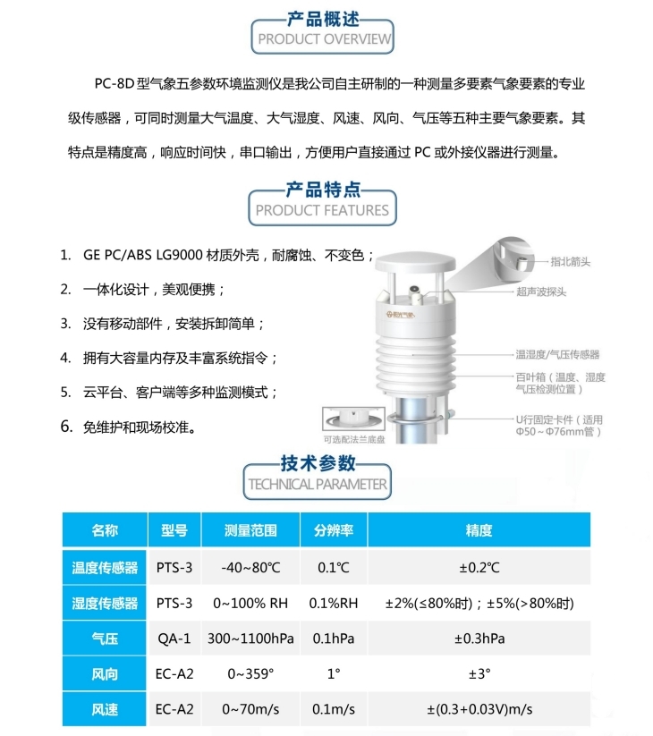 PC-8D型氣象五參數(shù)環(huán)境監(jiān)測(cè)儀是我公司自主研制的一種測(cè)量多要素氣象要素的傳感器,可同時(shí)測(cè)量大氣溫度、大氣濕度、風(fēng)速、風(fēng)向、氣壓等五種主要?dú)庀笠亍F涮攸c(diǎn)是精度高,響應(yīng)時(shí)間快,串口輸出,方便用戶直接通過(guò)PC或外接儀器進(jìn)行測(cè)量。