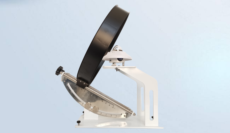 本裝置設有寬度為65mm,直徑為400mm的遮光環圈,固定在刻有緯度刻度與赤緯刻度標尺的絲桿調整螺旋上。標尺與支架固定在底盤上,根據架射地點的地理緯度而固定。總輻射表安裝在支架平臺上,其高度應正好使輻射感應平面(黑體)位于遮光環中心。通過調節赤緯度,可使遮光環全天遮住太陽的直接輻射。